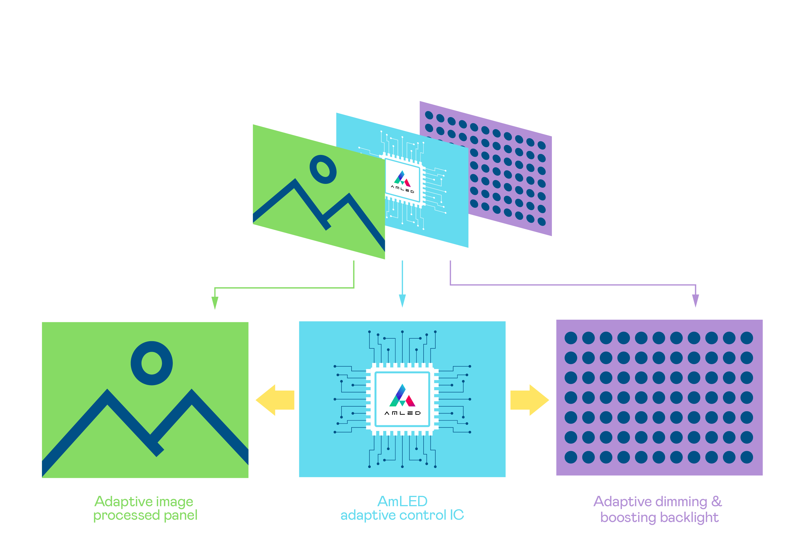 色容量 (Color Volume) 與對比度是評價顯示技術的重要指標,乐天使 AmLED 技術透過獨家動態對比及峰值亮度調變,達到 HDR 1000 極致高亮與層次分明的黑,大幅擴大從極亮到極暗的色域及表現層次,創造逼近真實世界飽滿、細膩又亮麗奪目的繽紛色彩。AmLED 以 Mini LED 作為顯示器的背光單元,實現高精細度的二維矩陣局部調光 (Local Dimming),提高畫面的動態對比範圍,其採用無機發光源,材料特性穩定,發光亮度可為有機 LED(OLED) 的數倍,也不會影響元件的壽命或造成烙印(Burn-in)現象。